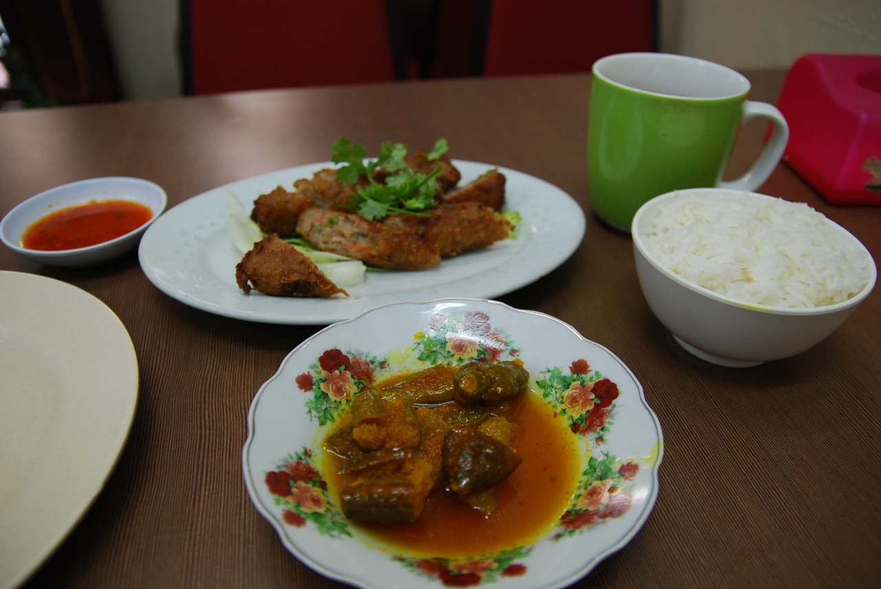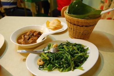 写真の2品に白米とお茶、デザートに、マラッカ名物のパームシュガー、グラムラカを使ったデザート、オンデ・オンデを頼み、テイクアウトでちまきを買ってしめて20リンギットでした。