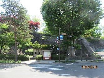 大通りア-ケード街の一本南の道の突き当りに信号の所に石垣が見えてきました。