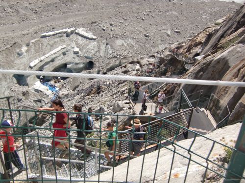 シャモニ駅から赤い登山列車に乗って20分。駅でモンブランマルチパスを買っておくと便利だし、お得です。目の前にメールド・グラス氷河が広がります。ロープウェイを使って下へ降りて氷河の中へ入っていくことをお勧めします。ロープウエイを降りてからも結構歩いております。また帰りはこの階段を上る事になります。