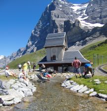 アイガーグレッチャー(2320m)からクライネシャイディックまでハイキングしました。ユングフラウヨッホを13時ぐらいに出発、途中駅アイガグレチャーで下車13時35分着。 クライネシャイディックを眼下に見ながらゆっくり下りていきます。 途中足湯ならぬ足水(結構冷たい)があったので靴を脱ぎ靴下も脱いで足を漬けて見たりしました。 長くつかることはできませんが気持ちよかったです。