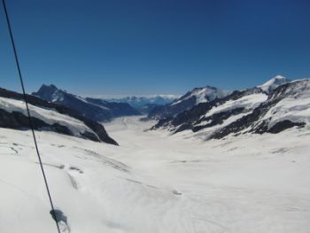 ヨーロッパで最長のアレッチ氷河は全長22キロ、氷の厚さは900メートルもあるそうです。もちろん氷河の上に降りることもできます。雪がちょっと湿っていて滑りそうで怖いですが、トレッキングしている人をたくさん見ました。