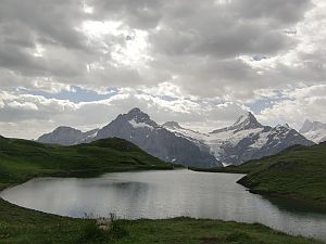 Bachaipsee (バッハアルプゼー)2265mまでは、フィルストの展望台2171mから緩やかに上ったり下りたりしながら約1時間歩きます。 ハイキングコースは迷うような場所ではなく多くの人たちがバッハアルプぜーを目指していました。湖に到着するとWetterhorn(ヴェッターホルン 3701m)切り立ったSchreckhorn(シュレックホルン 4078m)が そびえていてとても美しいです。