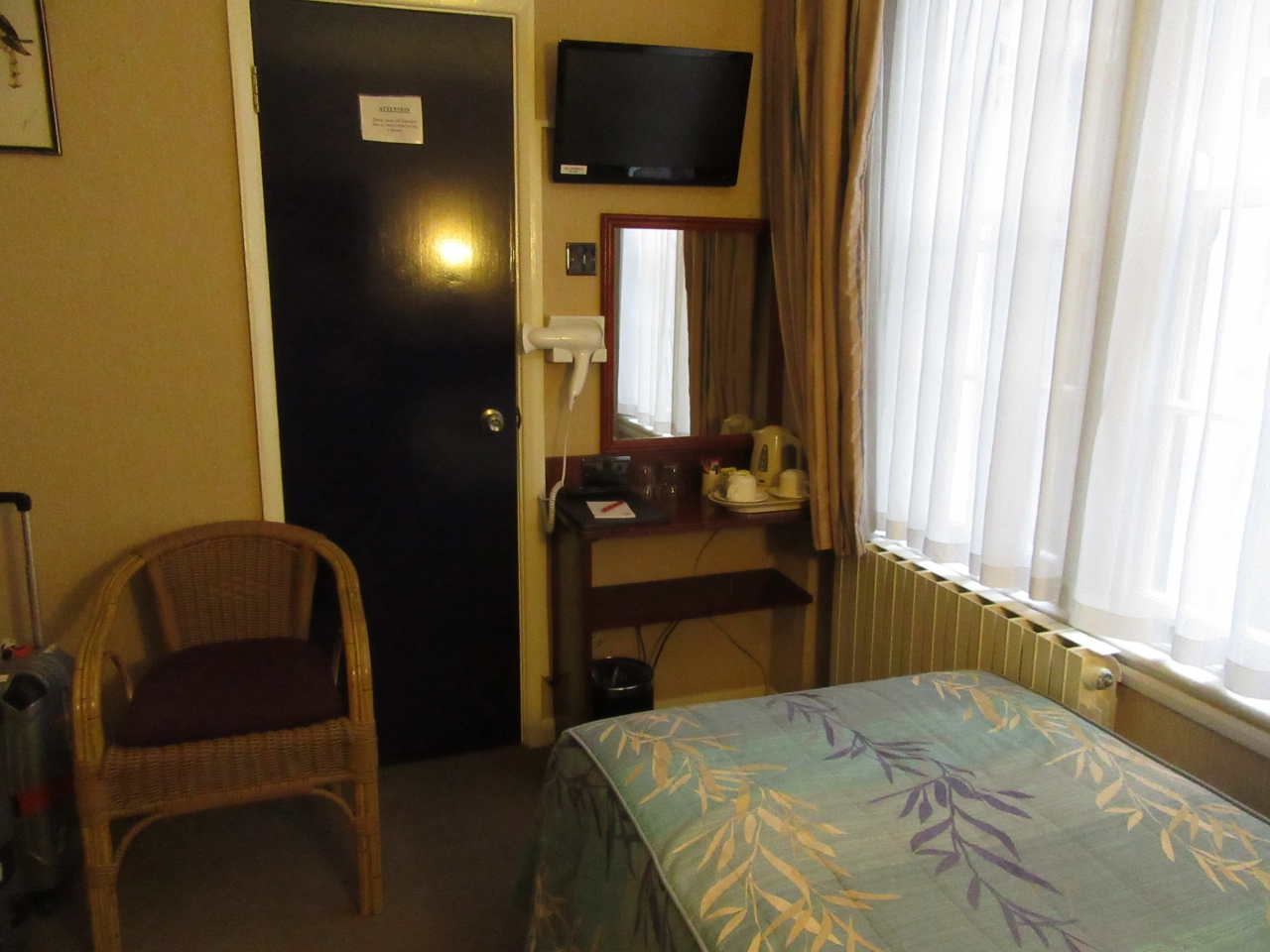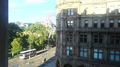 Airlinkのバスをwevery bridgeで降りてスコット・モニュメントをを探すとその斜め向かいがホテルです。入口を入ると階段なのでフロントまでスーツケースを運ぶのが少し大変でした。部屋は3階で窓からエジンバラ城が見えました。