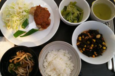 病院の診察の時行かれる方が多いと思います。とても薄味でカロリーが少ないので病院の職員の方も利用されてました。頂いたのは日替わり定食で鶏肉のピーナツバター焼き。とても香ばしかったです。(約500キロカロリー800円)コーヒーとケーキやさしい甘さでした。(100キロカロリー)を付けて合計1200円でした。診察でない時も駐車券の処理をする機械に通せばOKです。