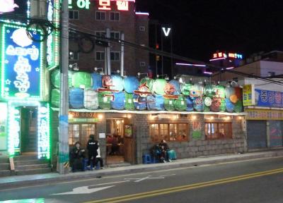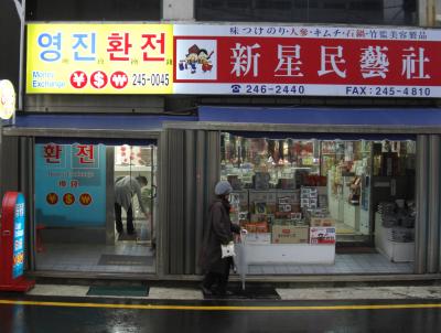 場所は、釜山観光ホテルの入口に向かって左に約70m位の所で、コンビニの前に有る新星民芸社(十字路角の土産屋さん:この店のお母さんが特に親切で、色々な情報を教えてくれます)のそばにある公認両替所です。名前は「映珍換銭」です。