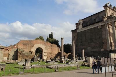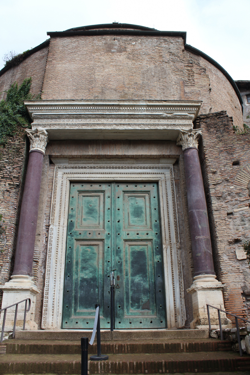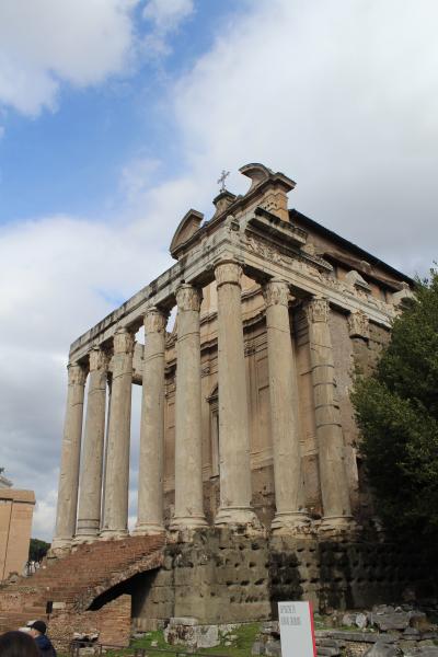アントニヌス・ピウスとファウスティナ神殿は、Via dei Fori Imperialiの入り口から入るとすぐ左にあります。
