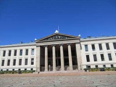 カール・ヨーハン通りに建つ黄色っぽい建物が1811年に完成したオスロ大学です。創立100年を記念して描かれたムンクの壁画がアウラ講堂にあります。