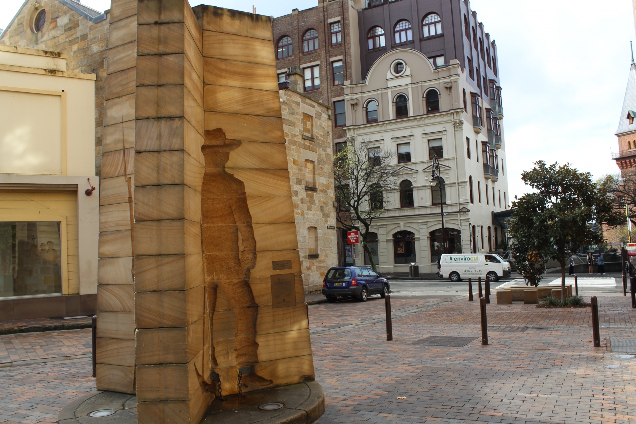 入植を記念したもので、入植時代の象徴である囚人、兵士、自由移民家族の姿が3面に刻まれています。