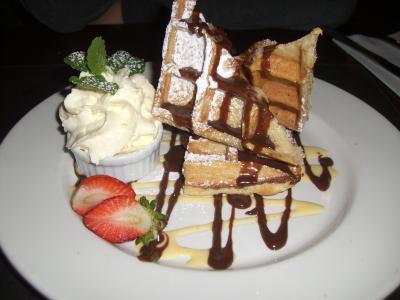 ホテルのロビーでお勧めのお店はない?と聞いたところ、地元で人気のお店があるから行ってみたら?と地図を書いてくれた。そこは雰囲気もよく広くて居心地は◎オーダーしたステーキや付け添えも美味しく、マッスルも噂のとおり美味しかった!ベルギーのお店ならやっぱりシメはワッフルよね!という事でオーダーしたらぺロっと食べちゃいました。ここはおススメですよ~♪