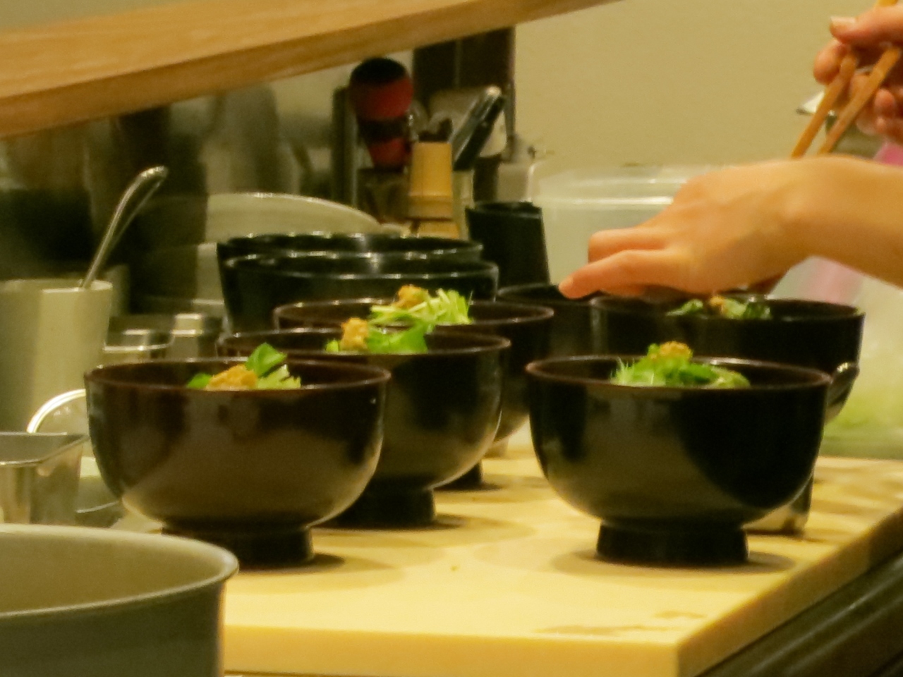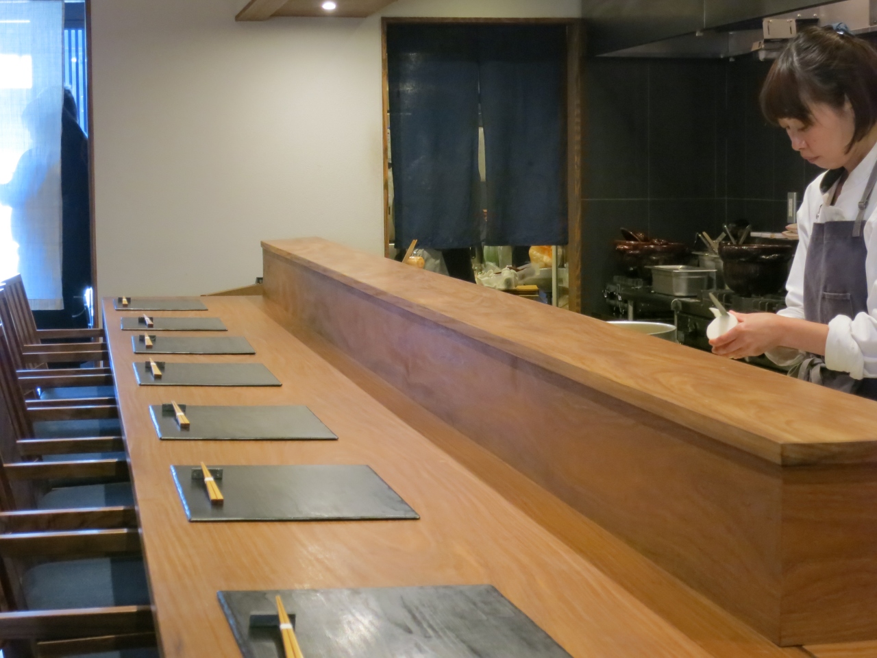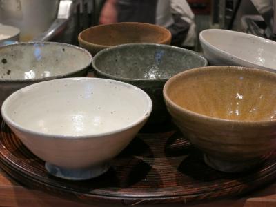 カウンターに座り、どのお茶碗でご飯を食べたいか選ばせてくれるのが