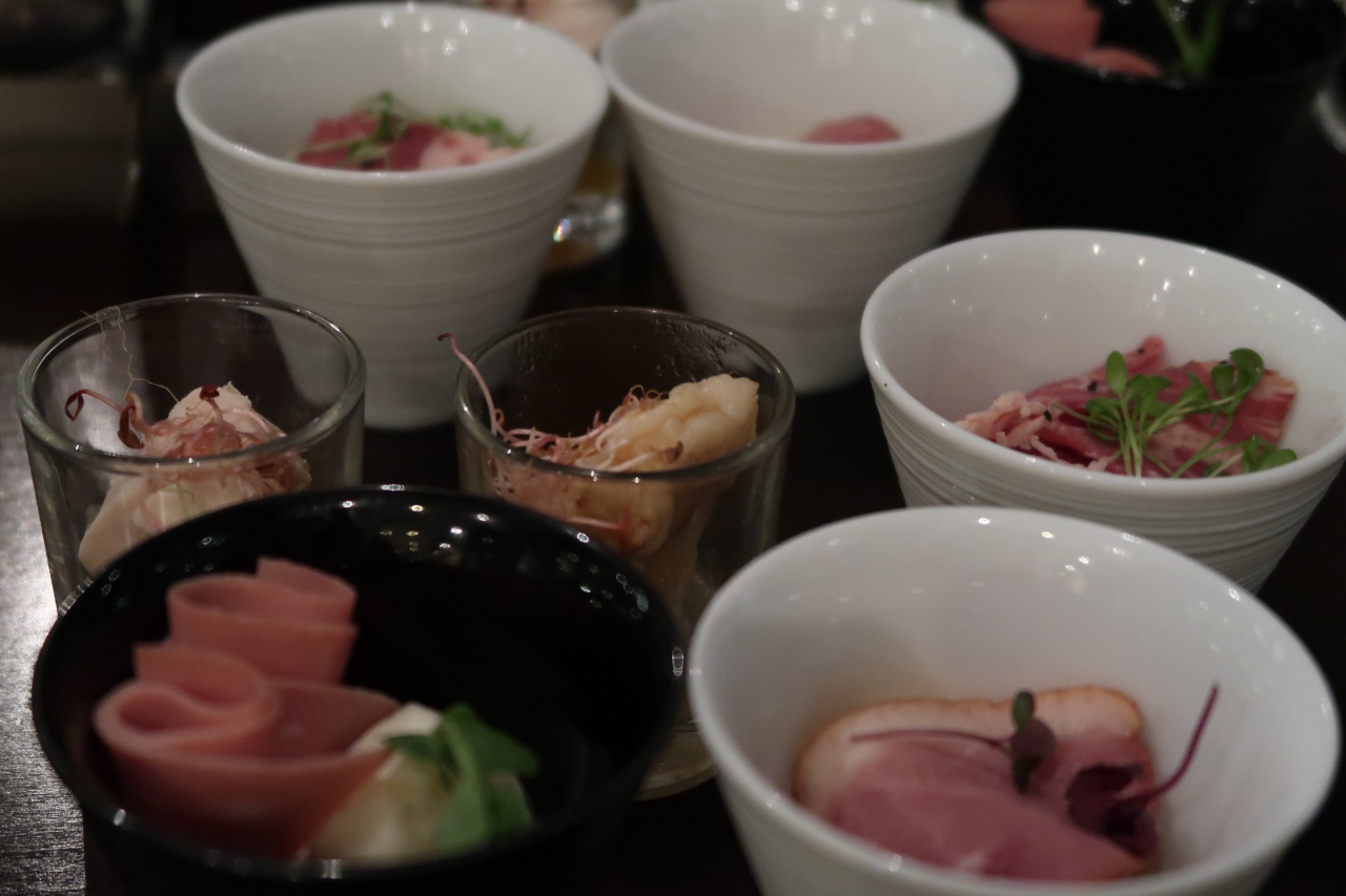 旬のお野菜を盛り込んだオードヴル、ベーグルサンド、自家製ピクルス