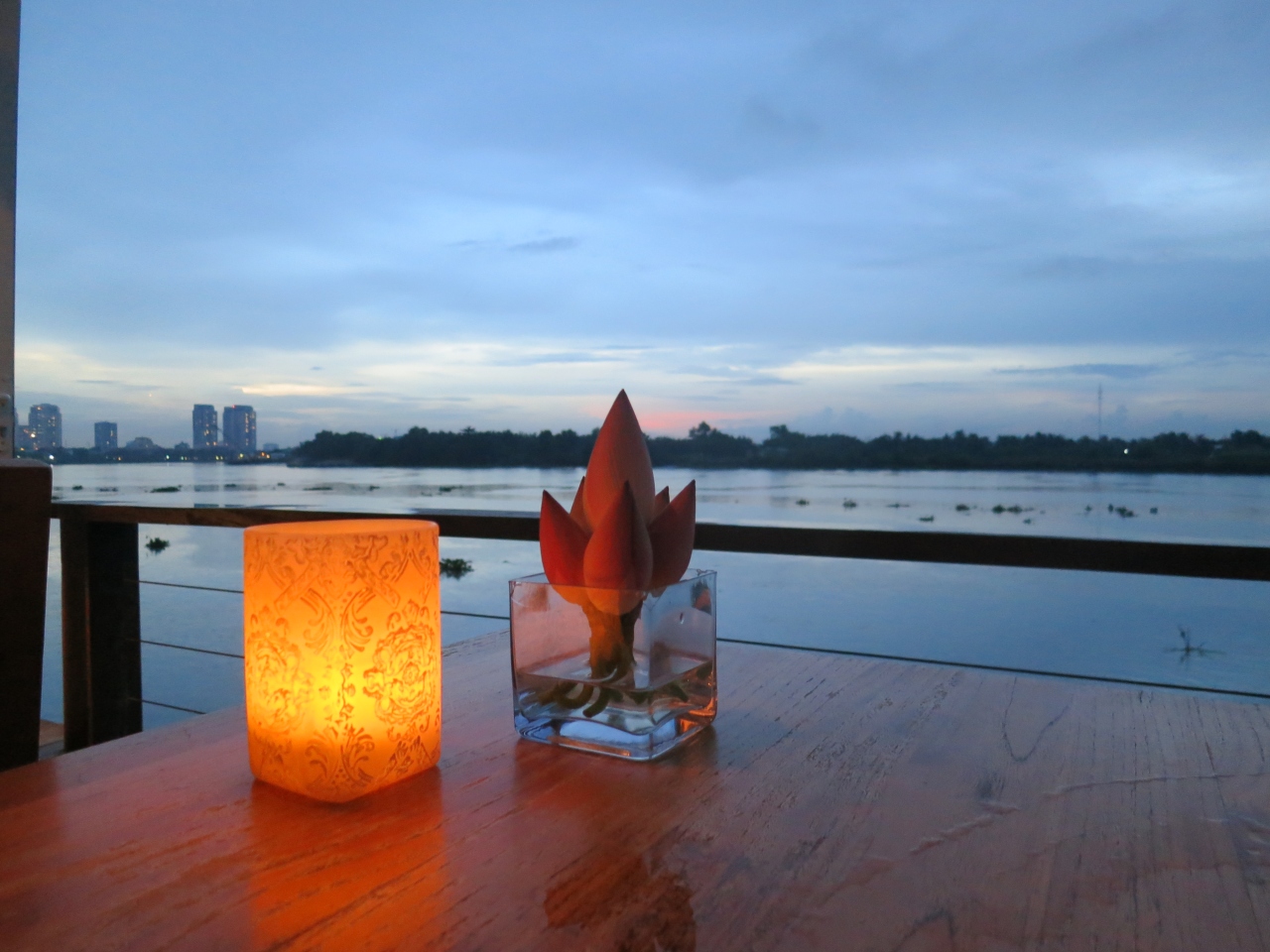 ホーチミン在住のお友達からこのお店等の情報をもらってチェックしていたら、このお店のHPに一目惚れ。ここに行きたくて予め予約を入れて行ってきました。二区エリアに興味があったので色々とこのお店に行く前にショッピング。思っていたより二区エリアが良すぎたため時間が足りない...無事お店についたら窓際の席へ。到着前まで雨が降っていたので景色はそこまで良くなかったけど、晴れていたらもっと素敵なんだとか。でも十分楽しめました^^食事の内容はフュージョン料理で、一般的な食事よりも創作って感じ。日本料理(天ぷらetc)もあったり 欧米人に人気のエリアなのでそりゃそうよね... 生春巻はライスペーパーの戻しが少し早かったのか固めだったけどそのほかは美味しく頂けました。中央部にはBARもあり雰囲気抜群。8時頃には席が埋まってたっぽいです。エントランスの方の席はおそらく予約無しで行った方が座るっぽくて、景色はイマイチ...絶対予約してデッキ席へ行ってください。帰りのタクシーは来るまで時間がかかるので帰ろうと思う30~40前に伝えておくといいと思います。私達が帰ろうとした時間は7時半だったかな。それでもなかなか来なくて8時くらいまで待ちました。夕方~夜は渋滞がひどいそうなので早め早めの対応がいいと思います。