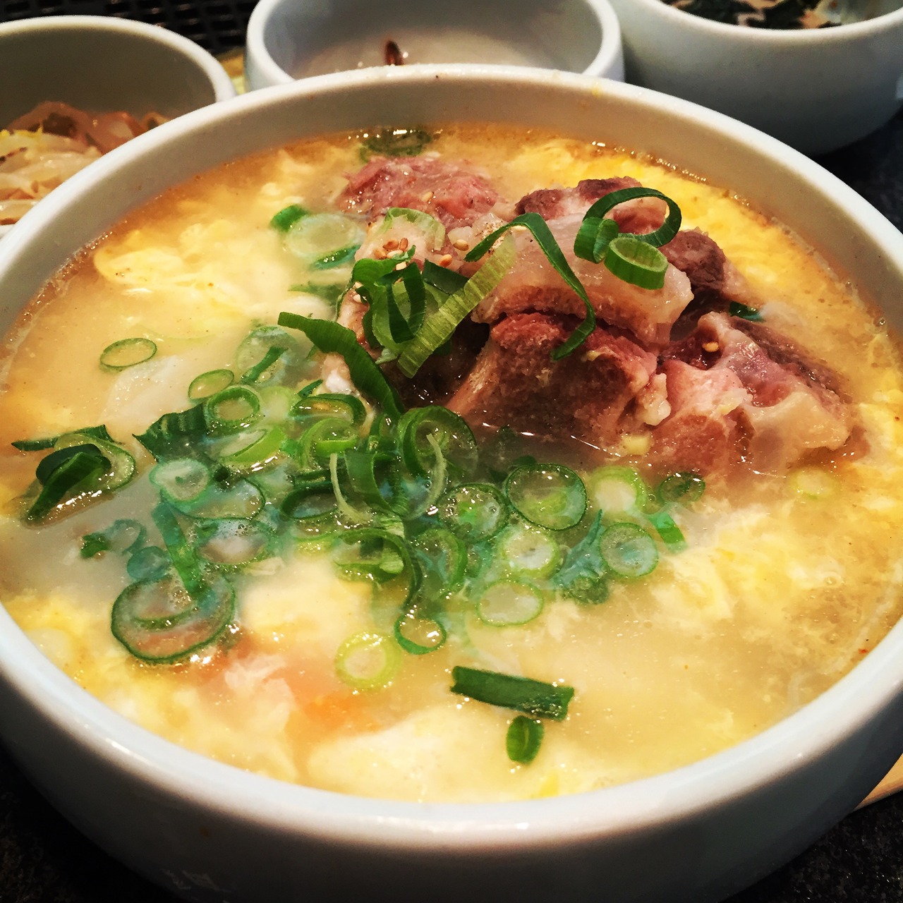 コムタンが大好きな私。たまたま入ったお店のオススメメニューがコムタンだったんだけど、ユッケジャンも捨てがたい…辛さを聞いたら1番辛いと言うのでコムタン定食に決定!バンチャンは4種類で蕎麦豆腐は初めて食べた。コムタンはこぶし大の牛テールが入っていてお肉がホロホロ!優しいお味で量はてんこ盛り。これで1080円?とは安すぎ!