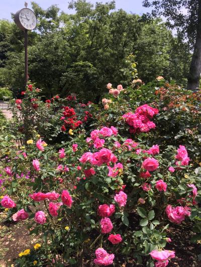 早稲田駅近くの入口から戸山公園に入り、グラウンド脇を抜けると子供用の水遊び施設がある。その向かいにバラ園がある。かなりの種類のバラが並び、バラの品種も掲示されている。6月上旬に行った時にはピンク系のバラがきれいだった。