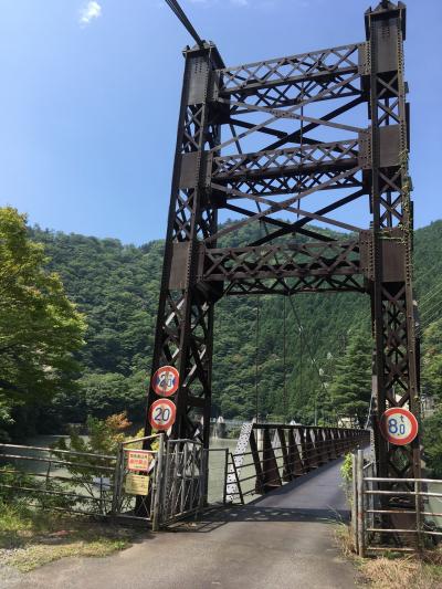さて、いよいよ橋を渡ると、かなり揺れる。高さは13mだが、足元を見下ろすとかなり足がすくむ。上流側には塩郷ダムが見える。吊橋は昭和6年に開通し生活道路として活躍、昭和36年に塩郷ダムができると天端が通行できるため、こちらが中心となった。