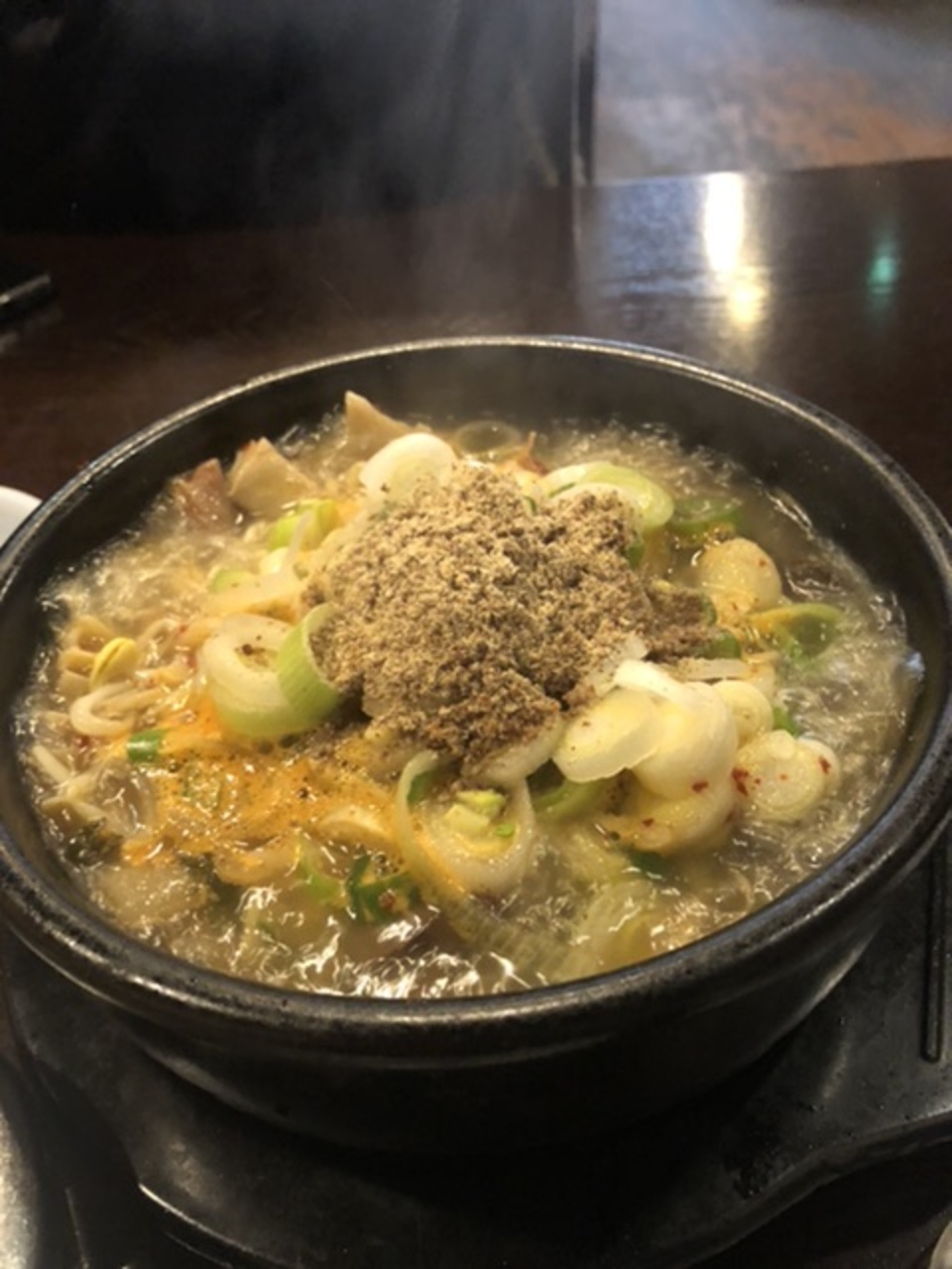 日曜日のランチタイムに訪問しましたが、店内は決して広いとは言えず、テーブル席で相席となりました。いつものネジャンタンとソンジタンのハーフハーフに、唐辛子ペーストを少しずつ溶かしながらいただきます。ランチにはご飯も付き、パンチャンはもやしナムル&カクテキ、お代わりにも快く応じてくれます。