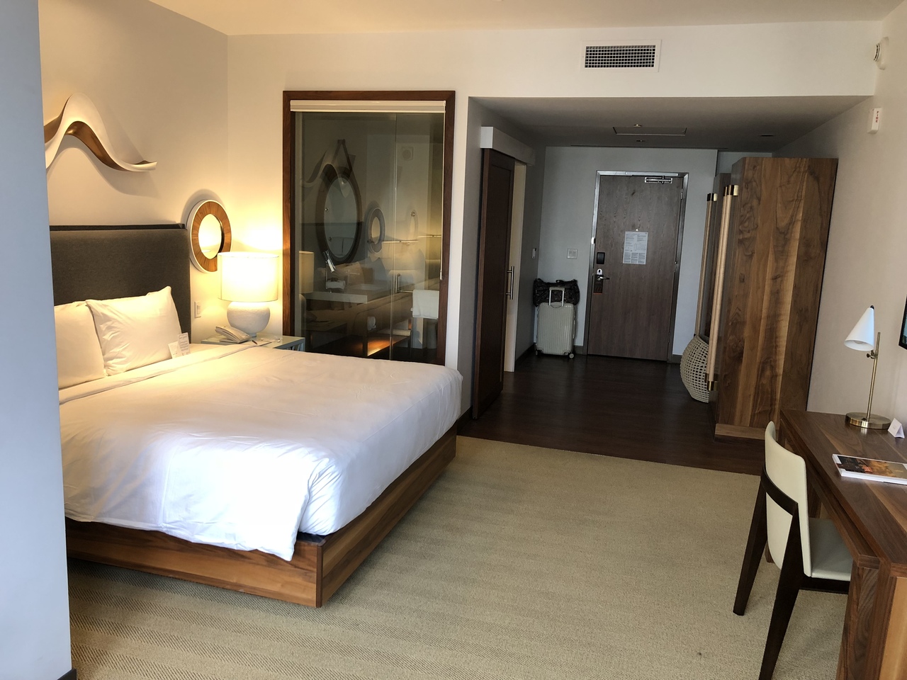 デザインが目を惹くデザイン系のホテル。ロビーに入った瞬間から旅が楽しくなると予感させるしつらえ。チェックインもPCであっという間に完了。室内の全てはiPadでコントロールするのが楽しい。狭いながらも大きな窓の開放感と、大きなスーツケースもベッド下に収納できるので、とても快適に過ごせる。