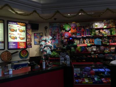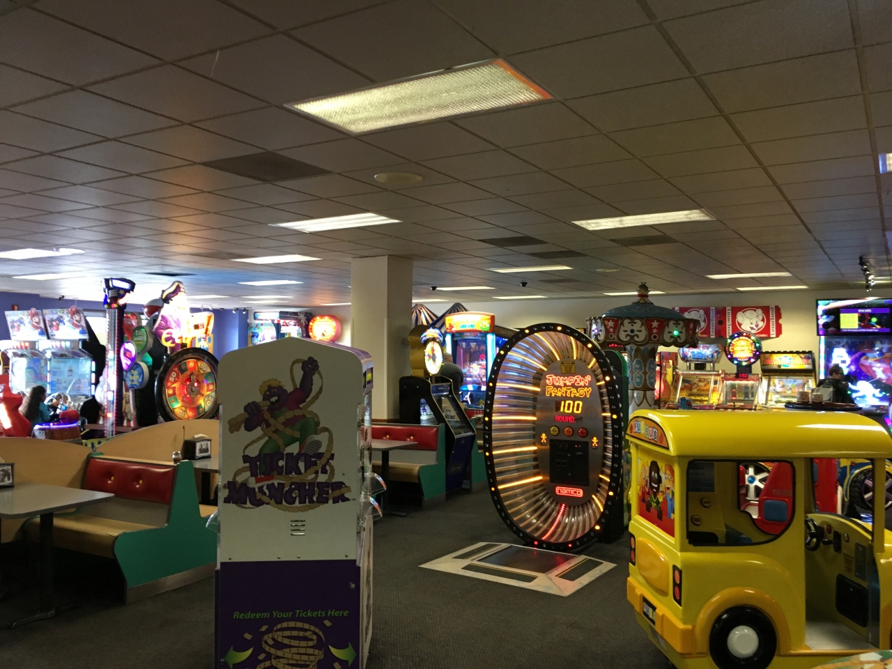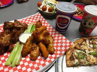 店内にはゲーム機がたくさんあり、ピザやチキンなど食べながら遊べます。