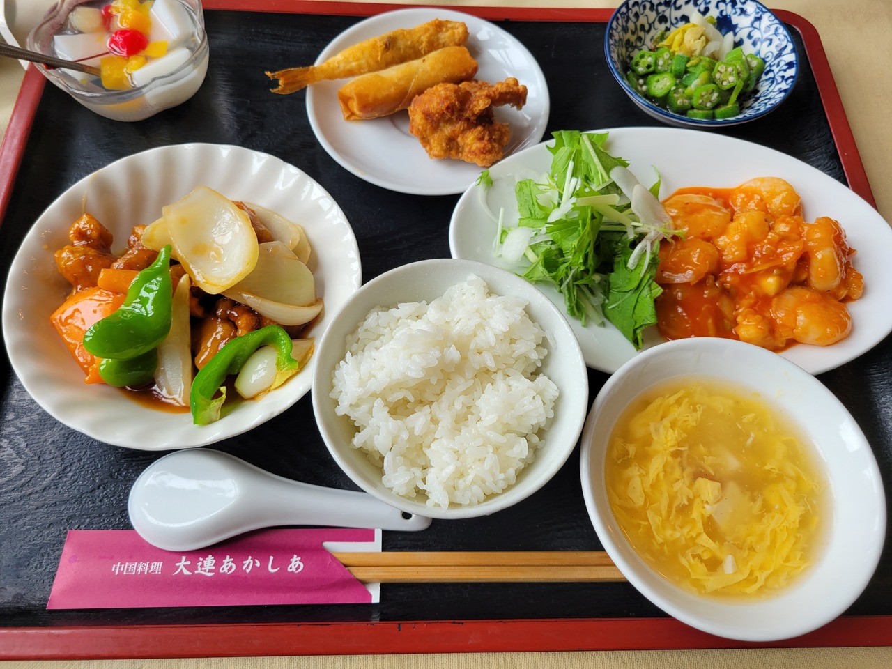 味は普通でしたが揚げ物やスープもついていて結構盛りだくさんでした。