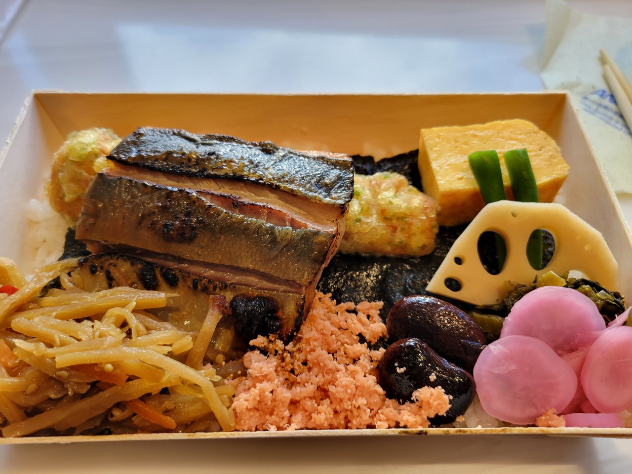 のり弁の定番、ちくわの磯部揚げとか入っていて