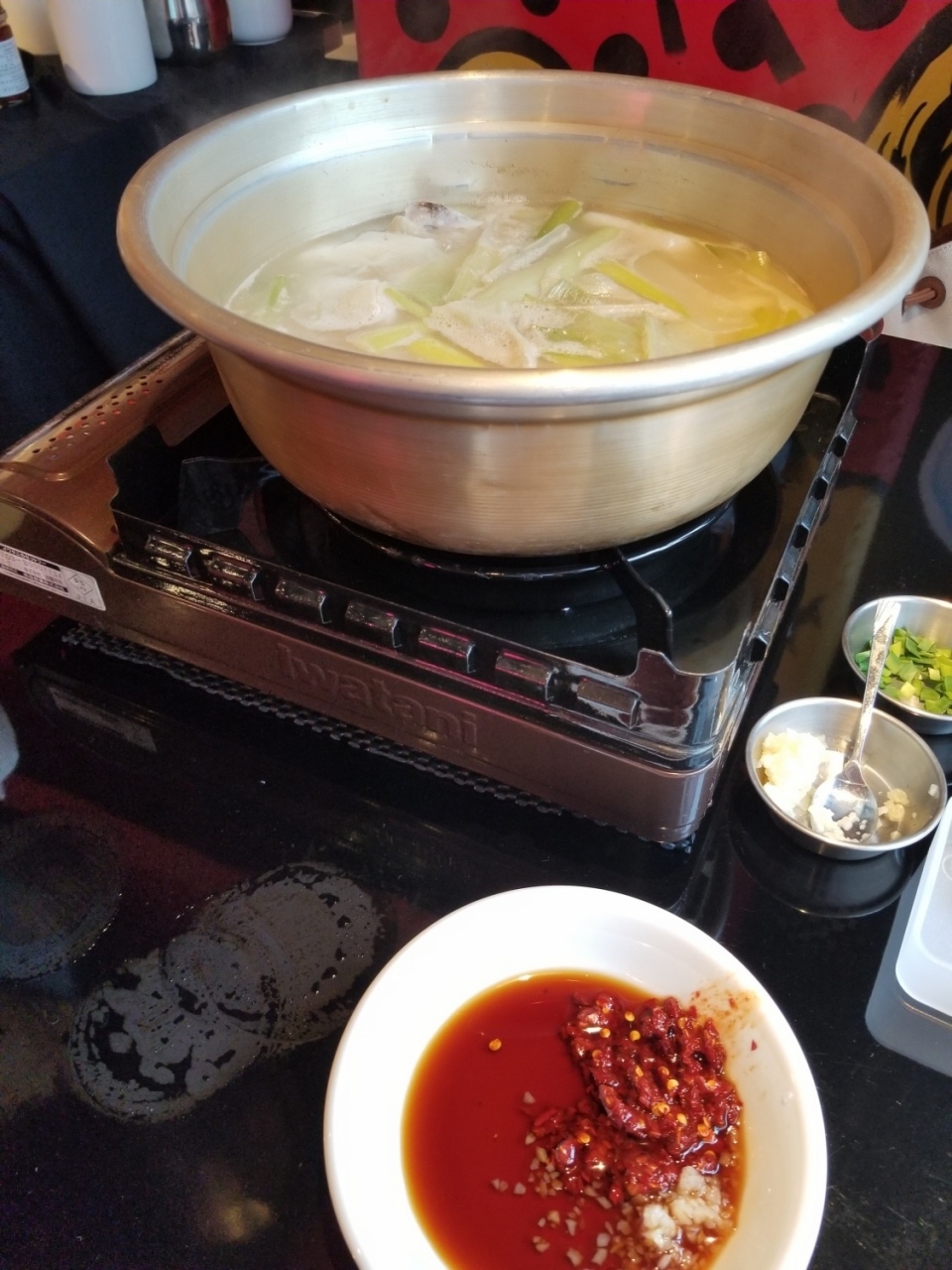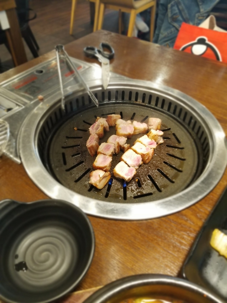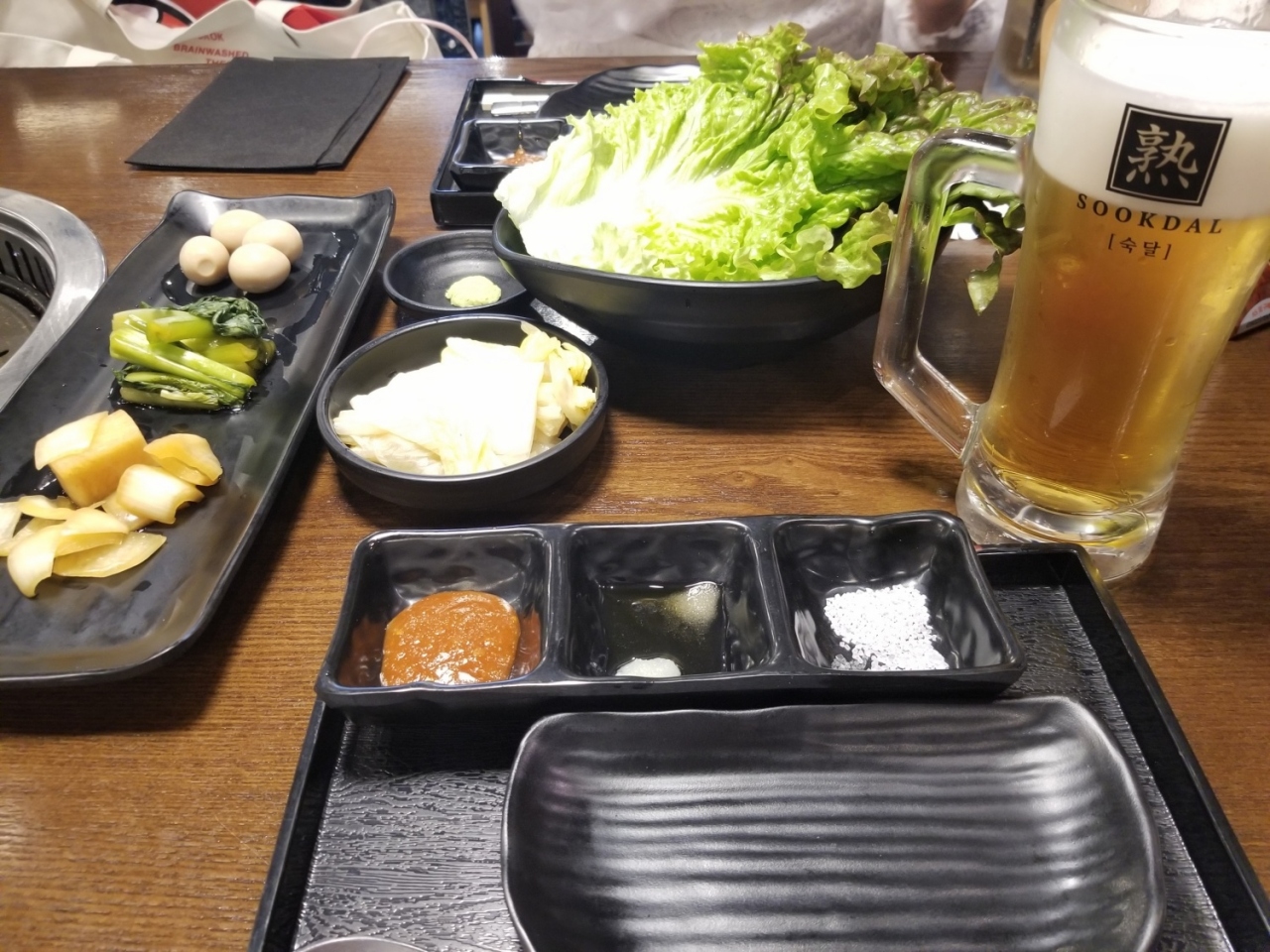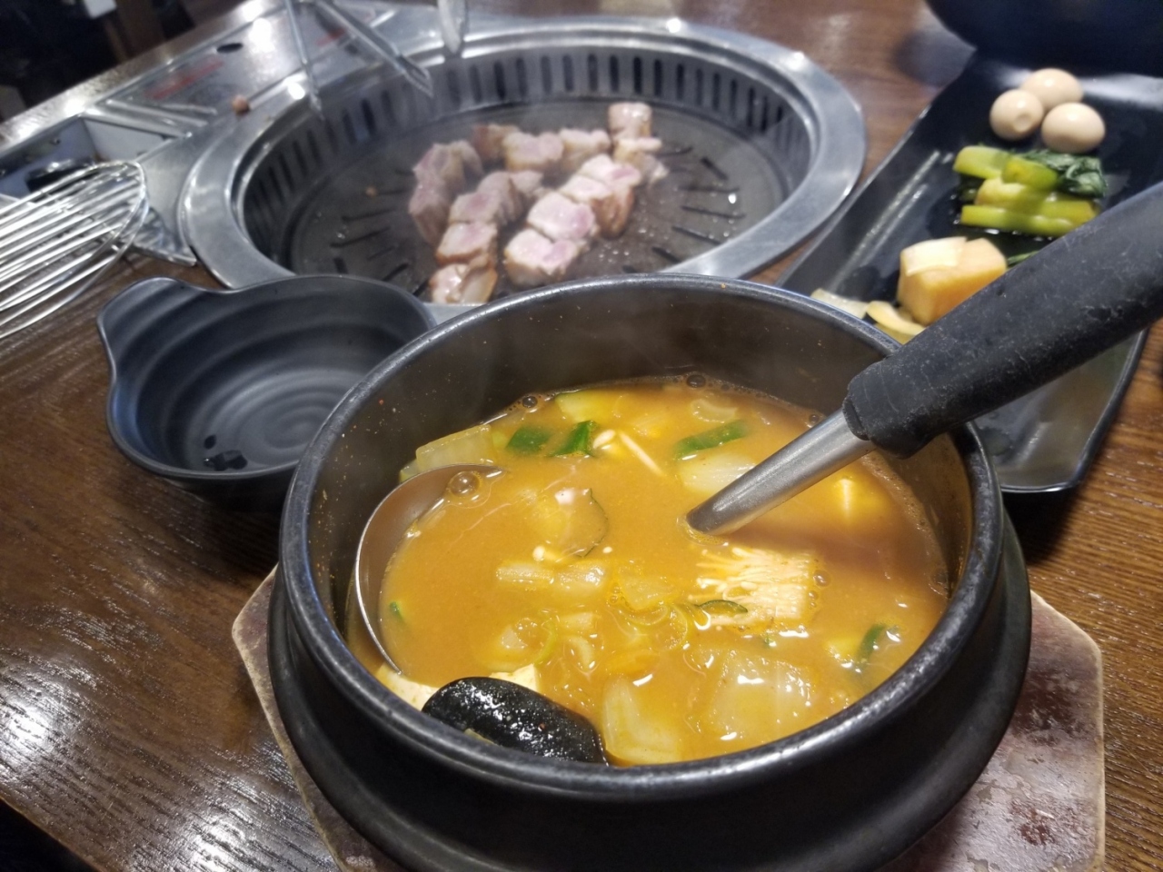 一番安いセットはドリンクとおかず・サムギョプサル・野菜・チゲ(3種類から選べます)・ライスで一人2,000円弱。