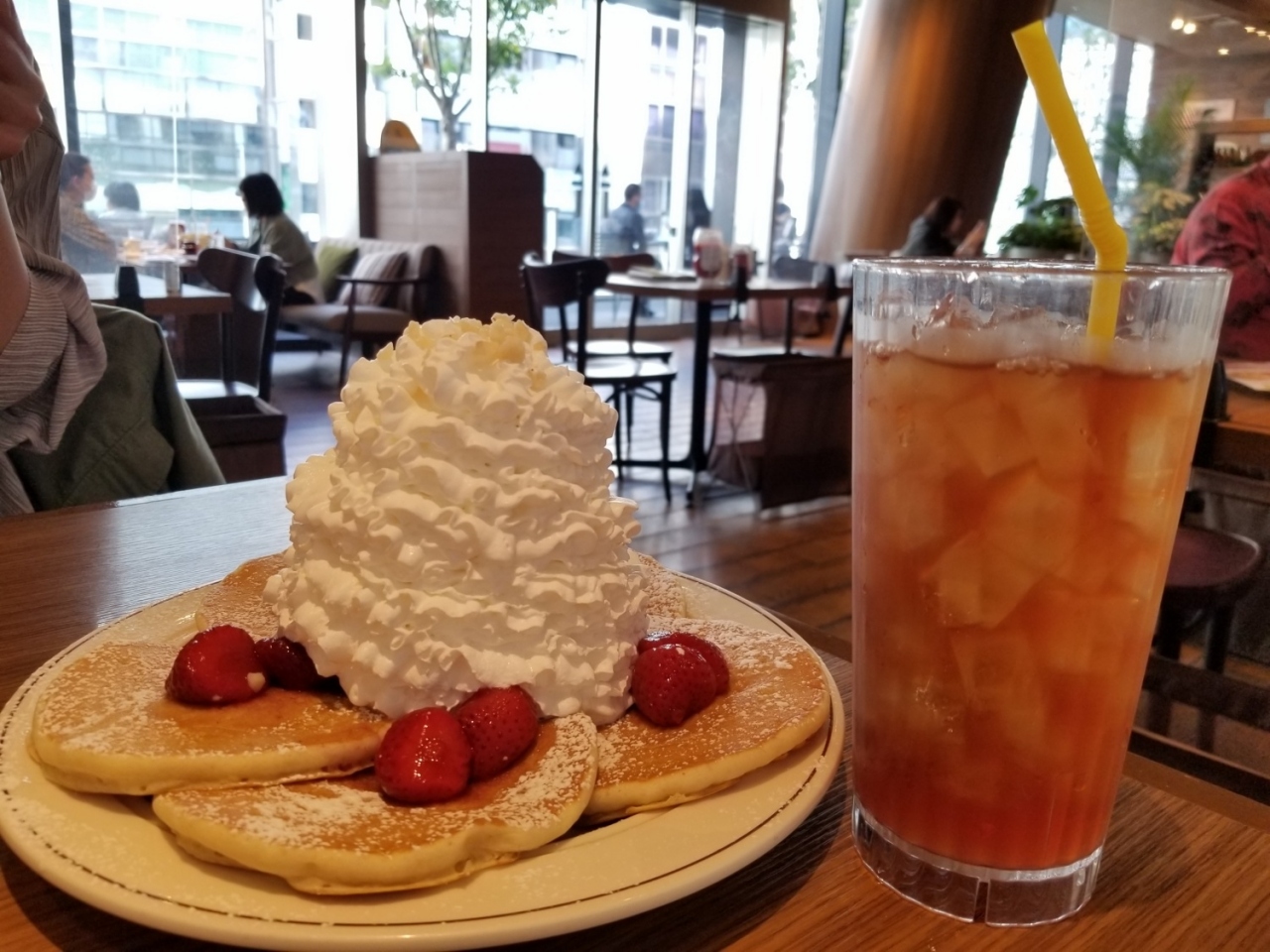 日曜の10時前に行くとテーブルは空いている様子なのに20分くら待たされたのが謎でしたが、生クリームもりもりのパンケーキを見ると甘党じゃなくてもテンション上がりました。