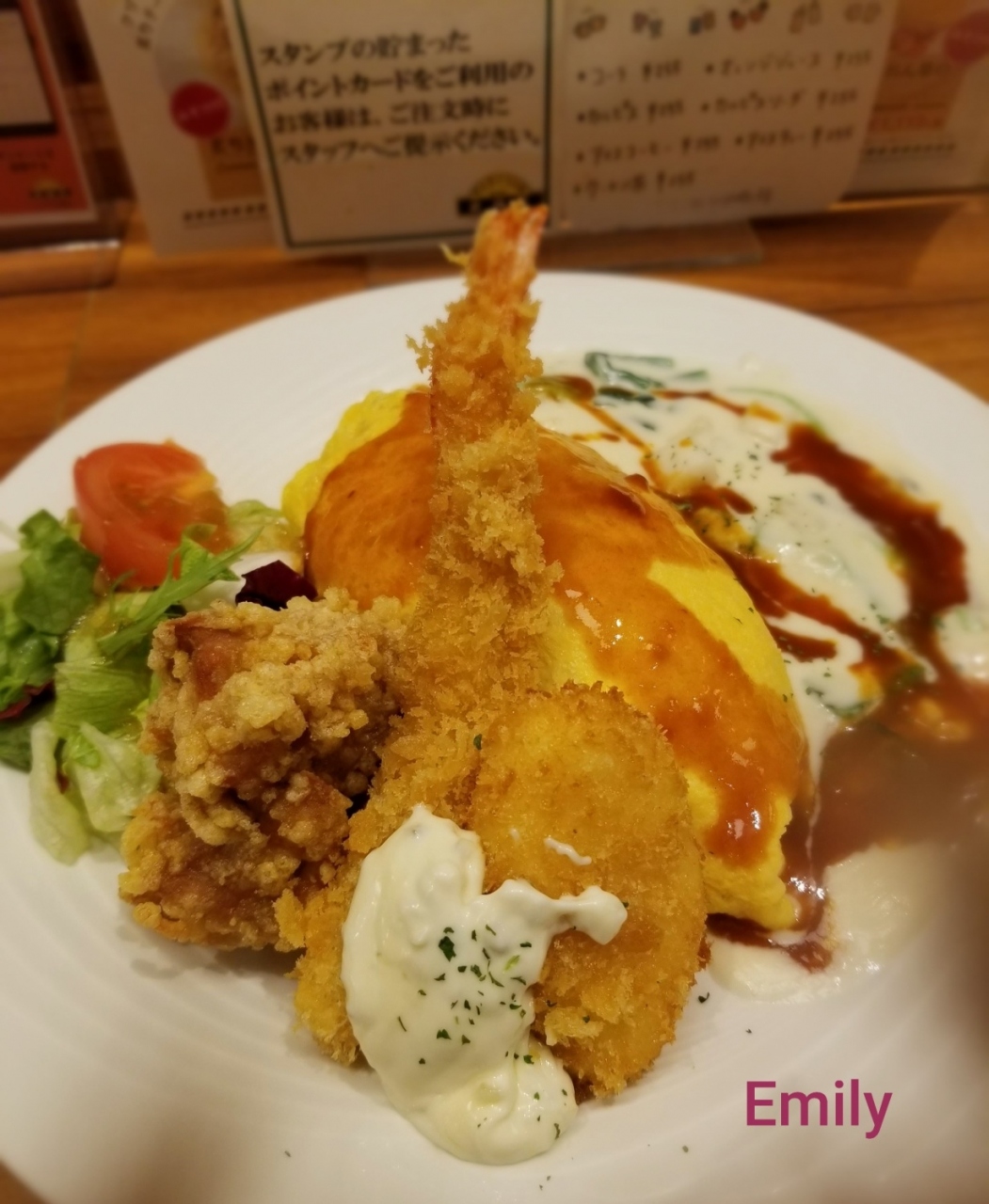 ルクア限定メニューはオムライスにエビフライ・クリームコロッケ・から揚げが乗っていてボリューム満点でした。
