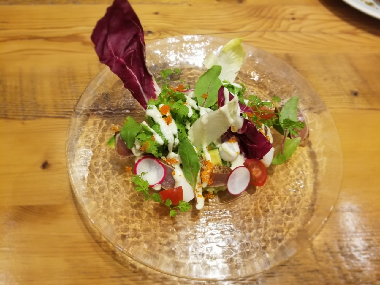 まぐろのたたきやカラフルなサラダご飯にしてみました。