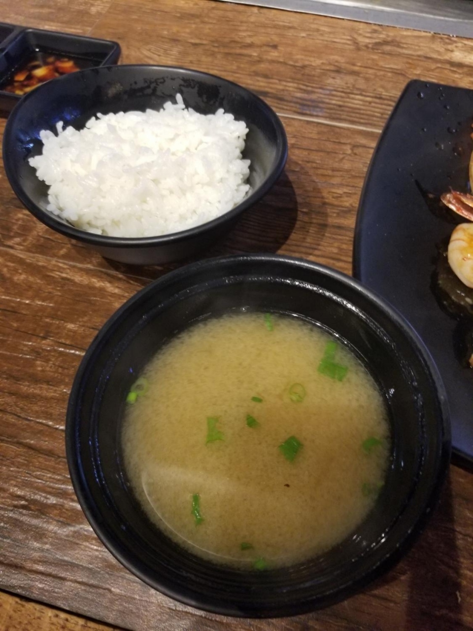 茶碗蒸し、赤だし、ごはん(炊き込みご飯と白ご飯食べ放題)も