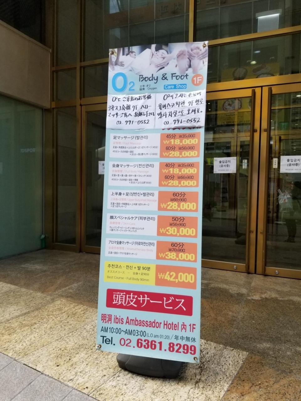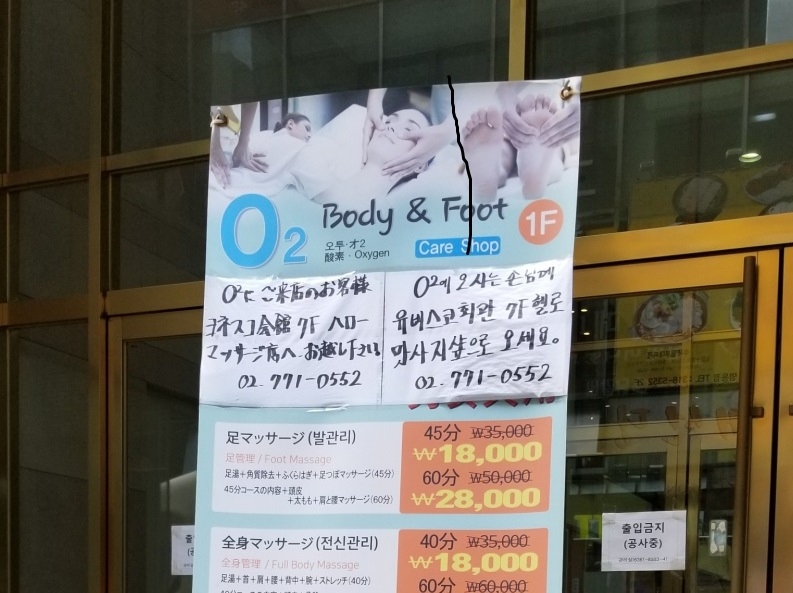 O2マッサージの看板にはハローマッサージへと案内する文章が書かれていました。- 旅行時期