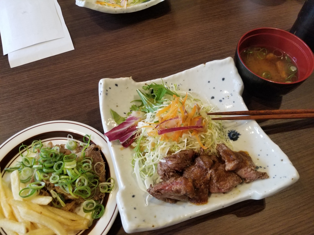 牛丼のようなもの、お味噌汁とポテトも食べ放題と、がっつり食べる人には