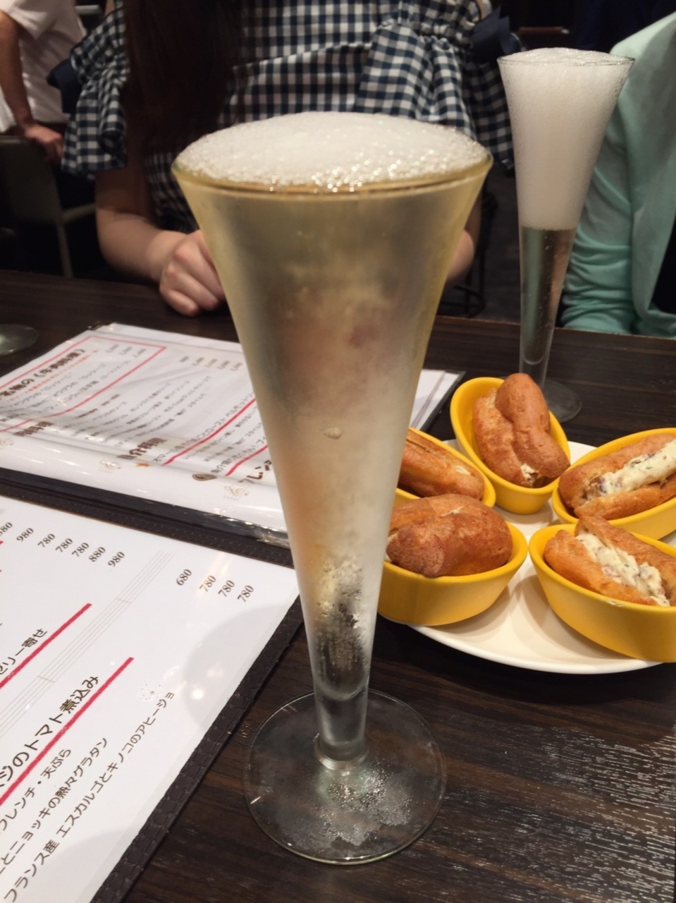 名物のグラスなみなみシャンパンやフォアグラ等をいただき