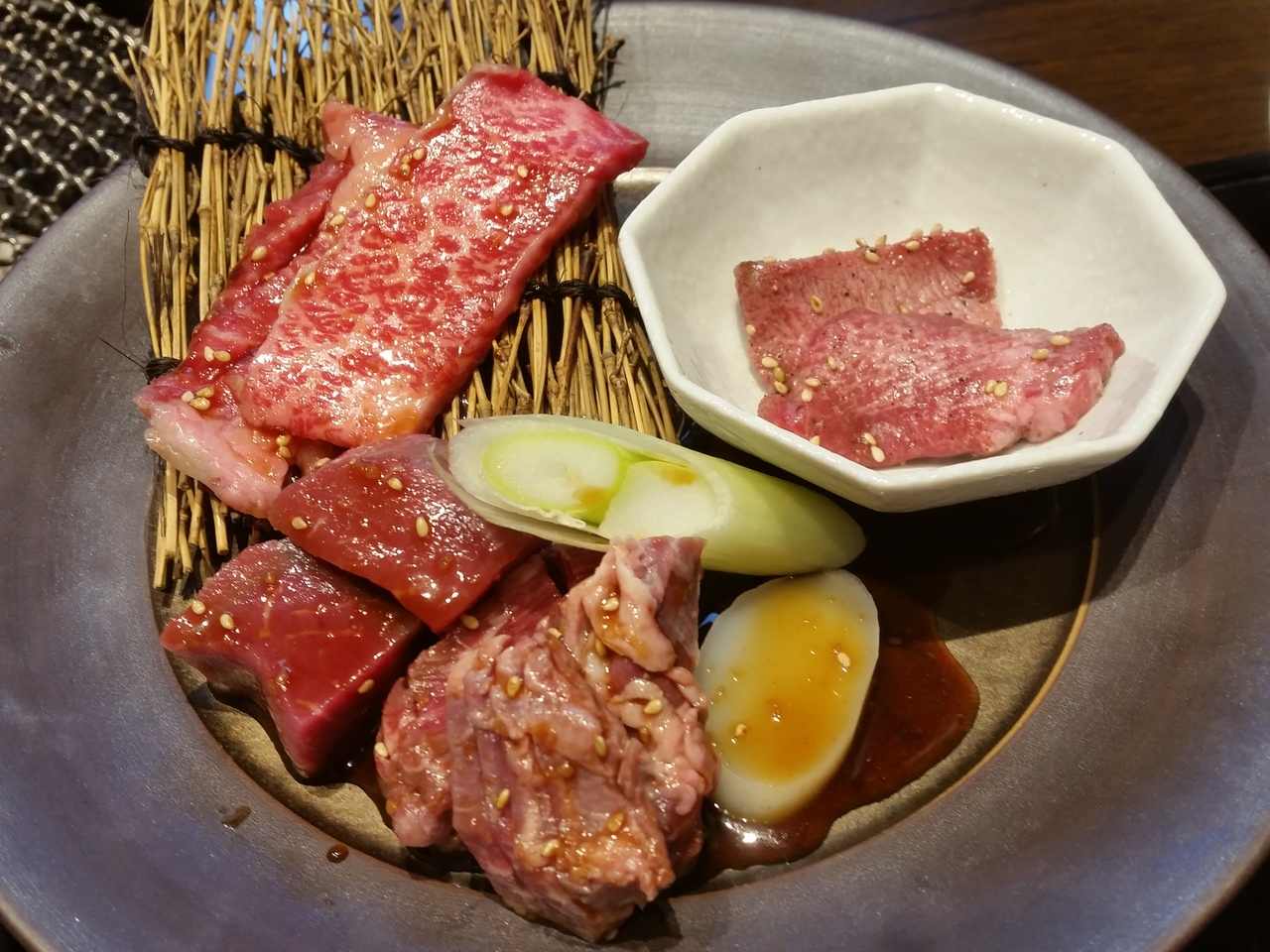 お肉数種類(塩タン含む)とご飯、スープ、キムチ等。