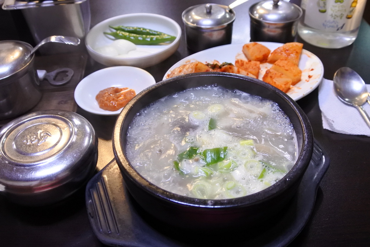半透明っぽいあっさり目のスープでアミ(エビ)やエゴマの粉を入れて調節。