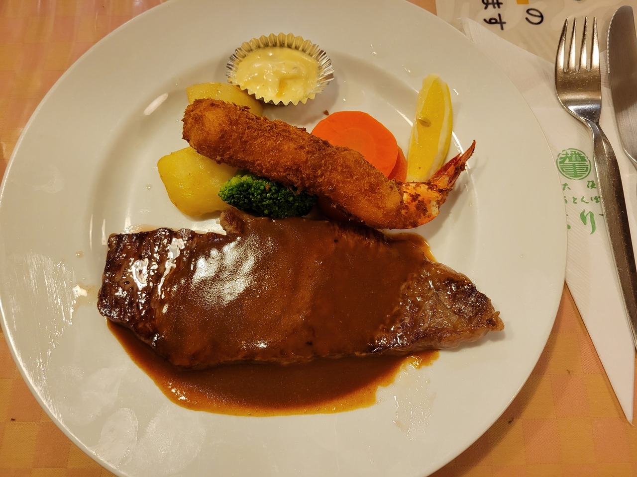 サーロインステーキとエビフライ、ライスかパンに食後のコーヒーか紅茶。