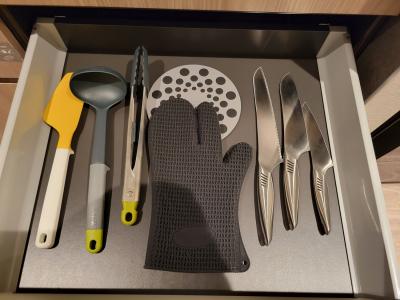 お部屋にはレンジ、コンロ等のほか、お鍋や包丁等も一通りそろっていました。