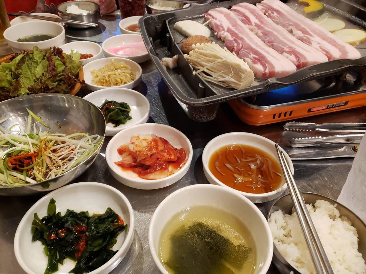 韓国風のテーブルセットのサムギョプサルやさんに入ってみました。