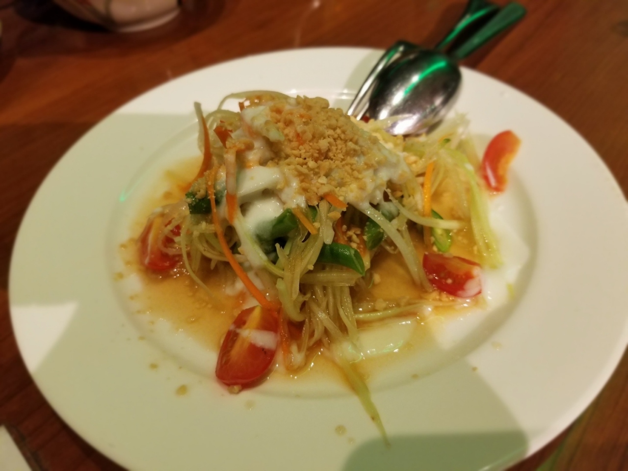 ソムタム(パパイヤサラダ)もヨーグルトが乗っていて辛くなかったし