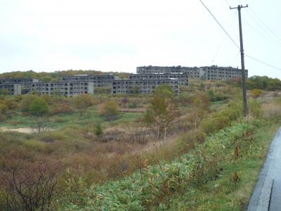 かつては東洋一の硫黄鉱山。現在は無人となり、廃墟となったアパート群が山の斜面に建ち並びます。