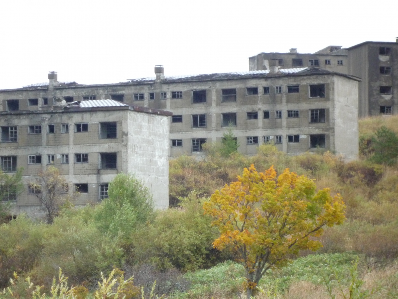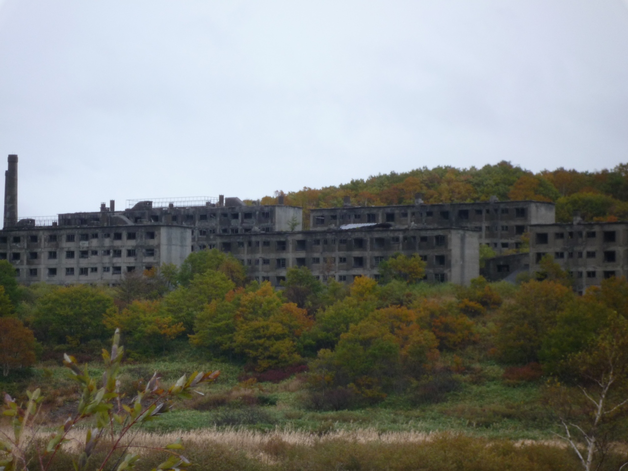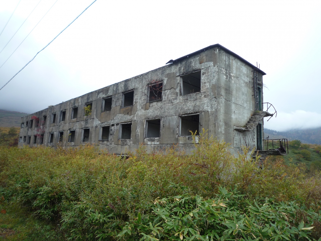 かつては東洋一の硫黄鉱山。現在は無人となり、廃墟となったアパート群が山の斜面に建ち並びます。