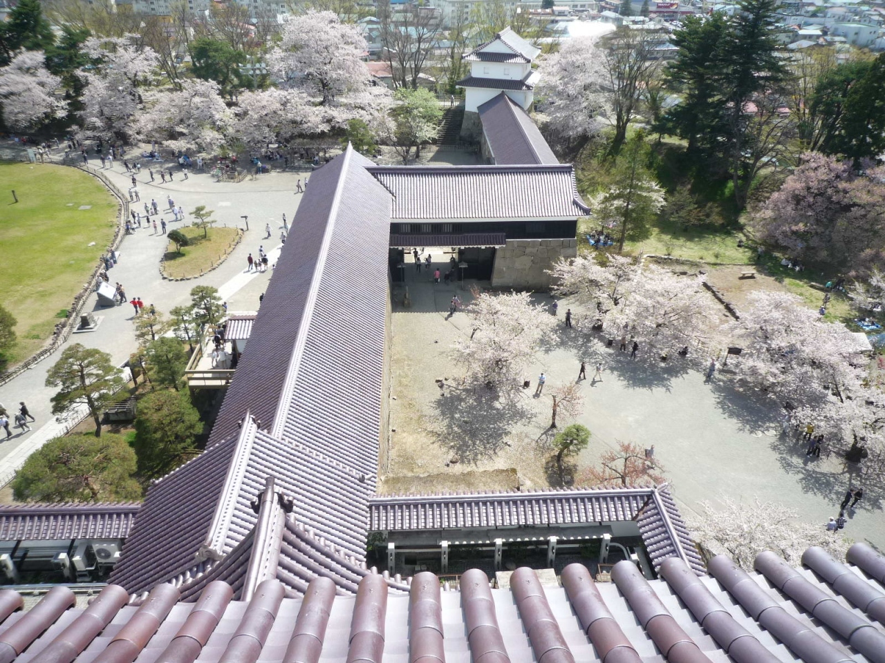 ちょうど桜の季節だったので、桜のピンク色の隙間からから見えるお城の城壁がとても趣深かったです。
