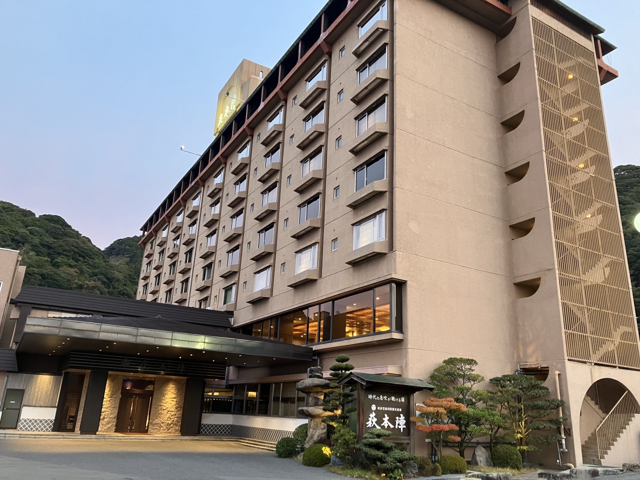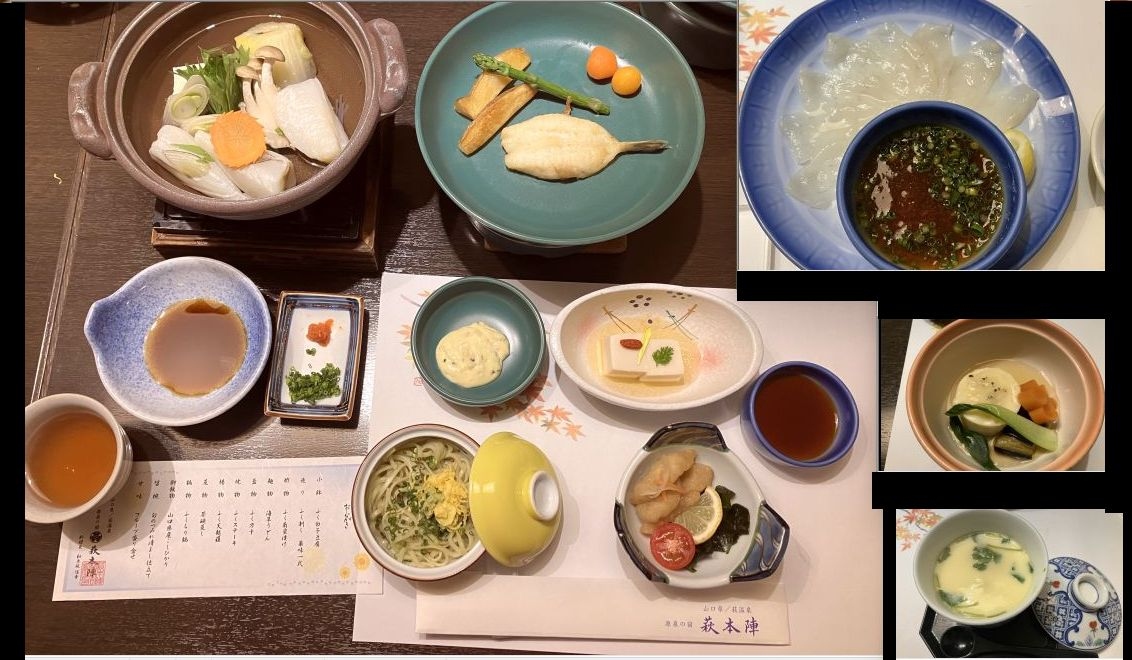 温泉は、庭園を中心とし回廊式に並ぶ露天風呂や、ジェットバスの14種類の湯めぐりが特徴で、ゆったり癒されました。夕食には、山口県を代表するグルメの1つ、フグ料理を頂きました。ふく刺し、ふくステーキ、ふくちり鍋など、とても美味しかったです!朝食は、和洋の多種多様のメニュー60種類以上のバイキング。行きは明倫バスセンターまで、送迎バスをお願いし、帰りは東萩駅まで、送迎バスをお願いしました。スタッフの方はどなたも非常に親切で、教育が十分なされていると感じました。お薦めのホテルです。