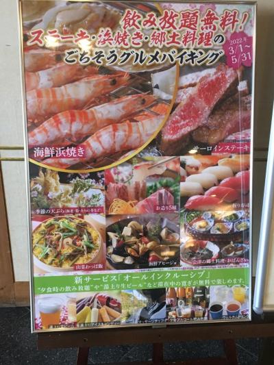 広い浴場がある温泉ホテルで、美味しい食事の、飲み放題無料!ステーキ・浜焼き・郷土料理のごちそうバイキング と言うプランを選択しました。飲み放題、食べ放題は90分でした。海鮮やステーキなど色々な料理を楽しめて、美味しかったです。そして広い浴場には本当に癒されました。
