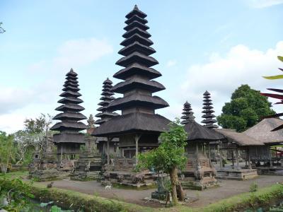 タマンアユン寺院は、バリ島で2番目に大きな寺院 かつて17~19世紀に栄えたメングウィ王国の都であったメングウィの東2kmほどにあります。タマンアユンは「美しい庭園」の意味です。1634年メングウィ王朝のイ・グスティ・アグン・アノム王によって建立されました。寺院の周りには堀が巡らされております。その堀池にはたくさんのハス(神が座るとの事)が群生しています。全部で10基のメル(聖なる山、アグン山を模したといわれている塔)が整然と建ち並んでいます。その中で、唯一至高神を祀る格式の高い11層のメルが4基あります。普通のメルは奇数構成なのですが、大変珍しい2層のメルも1基あります。メルが並ぶ奥には、細かく細工されているガルーダの石像もあります。ウブドから1時間、クタからは車で約40分程度です。