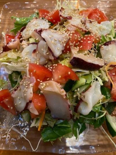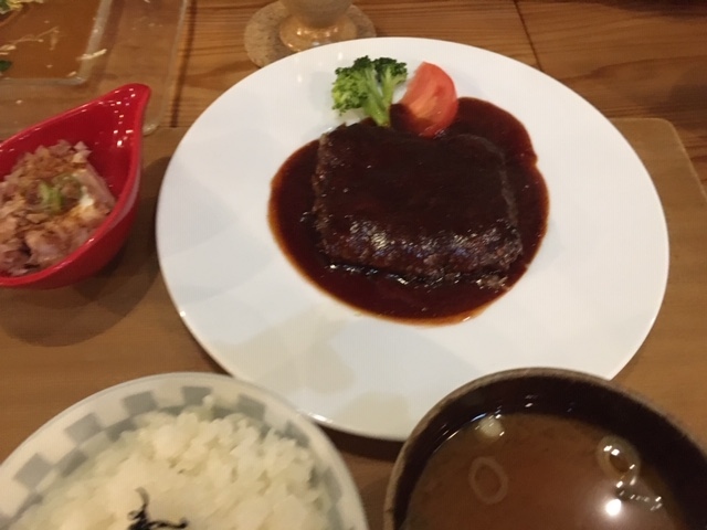 蛸サラダをおつまみで頼み、食事には私は松阪牛のハンバーグ、家内は季節ものの牡蠣フライをそれぞれ定食で注文。