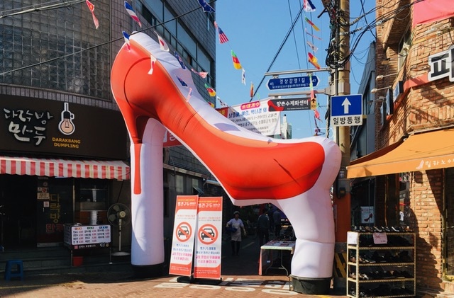 こちらには、1970年代から少しずつ店舗が建ち始め、一時は120軒を超えた時期もあったそうですが、今でも約60軒の店舗と工場が残っています。ちょうど、「赤い靴物語」というイベント期間中だったようで、賑やかでした。- 旅行時期