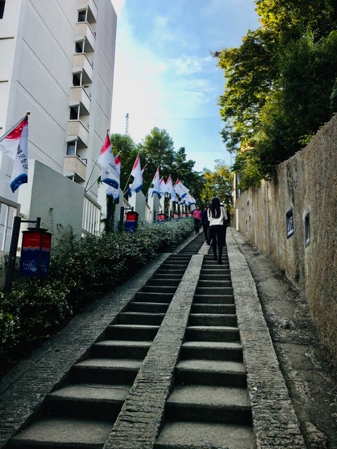 今回も大邱市内の街歩きしました。コースも整備されていて、大邱市中区のモデルコース「近代文化路地」を歩きました。「桂山聖堂」の前の大通りを渡り、90段ある小山に上がっていく階段が、1919年3月1日、日本統治時代にソウルで起きた独立を叫ぶ万歳運動は朝鮮半島の各地に飛び火し、大邱では、万歳運動を準備した学生らが日本軍の監視を避けて石階段を往来したという「三一万歳運動の道」です。