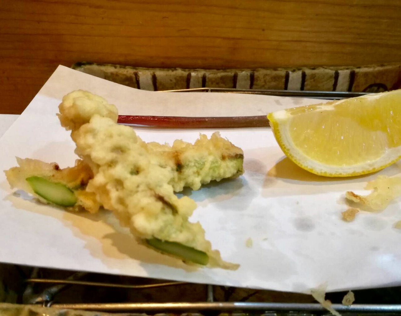 最初、お刺身が出て、揚げ前天ぷらのコースが始まります。内容は、その日の仕入れで変わってきますが、13、4品出てくるでしょうか。