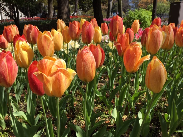 横浜公園は、横浜スタジアムのすぐ隣(裏)にある公園ですが、今年はここに70品種・約14万本のチューリップが植えられています。チューリップは新品種が多いように感じました。