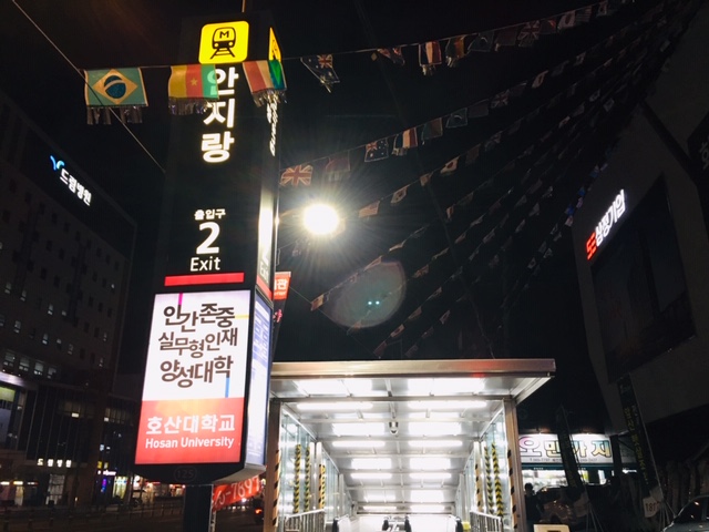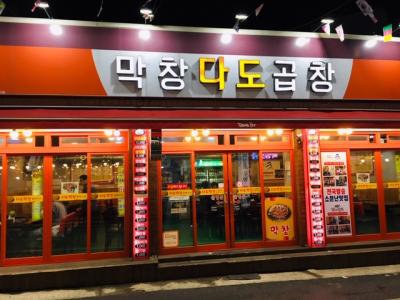 大邱都市鉄道1号線のアンジラン駅近くに、ホルモン焼きのお店が並ぶ「アンジランコプチャン通り」にあります。通りの左右にホルモン焼きがずらりと並び、どこに入るのか迷いそうですが、割合大きい店ですっきりした店構えでここを選びました。